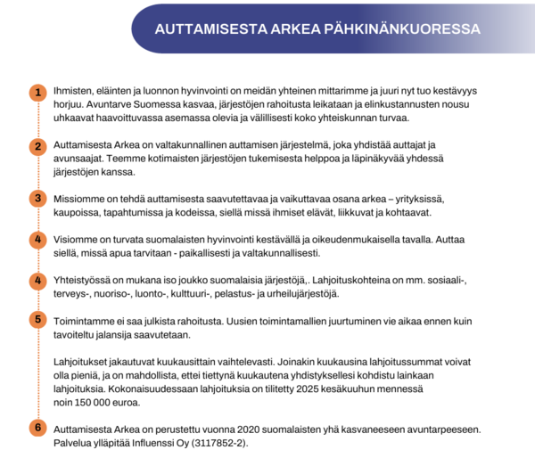Auttamisesta Arkea on perustettu vuonna 2020 ja se on valtakunnallinen auttamisen järjestelmä, joka yhdistää auttajat ja avunsaajat. Avuntarve Suomessa kasvaa, järjestöjen rahoitusta leikataan ja elinkustannusten nousu uhkaavat heikoimmassa asemassa olevien arkea ja koko yhteiskunnan turvaa. Auttamisesta Arkea syntyi tästä tarpeesta – yhdessä suomalaisten järjestöjen kanssa.
