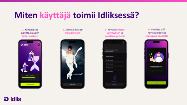 Mikä on haaste / miten Idlataan? Sovelluksessa katsot muutaman mainoksen ja vastaat pariin yksinkertaiseen kysymykseen. Kysymykset voivat esimerkiksi koskea kuluttajakäyttäytymistä, joihin mainostajat haluavat vastauksia.